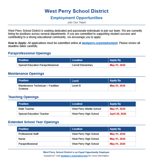 The West Perry School is currently hiring for several positions. Please pass this information on to anyone you think would be a great addition to our team. All opportunities are on our website at h...